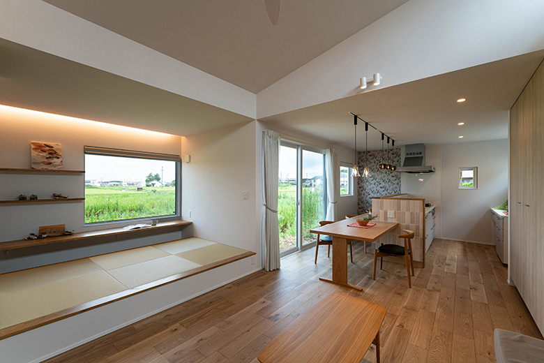 のどかな田園風景を日常に取り込むために、住まい全体を北側に開き、各部屋から田んぼの広がる風景を楽しめるように設計された平屋。