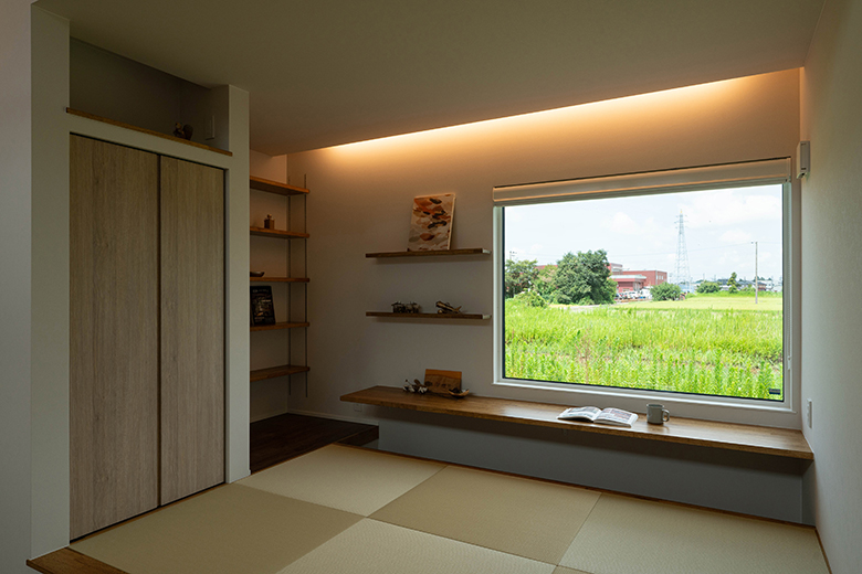 リビングの一角には、タタミコーナーと造作カウンターを設け、読書やティータイムをゆったりと過ごせる、特別な「居場所」をつくった。