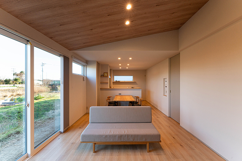 外観はシャープで美しい四角形のフォルムとし、西川側に大きく開いた窓から光と風をたっぷりと取り込む、明るく開放的な住まい。