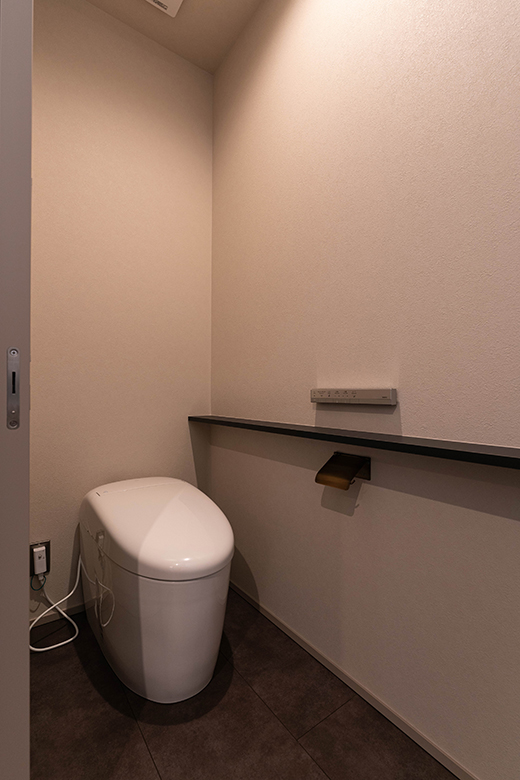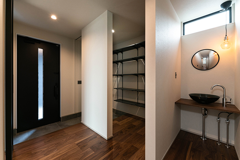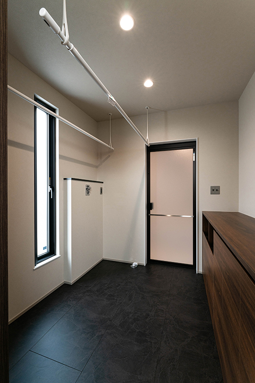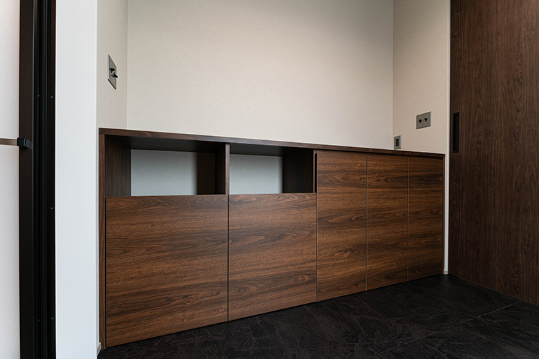 ランドリースペースには、暮らしの動線に寄り添う造作カウンターを設け、家事のしやすさと日常の快適さにも細やかに配慮した。