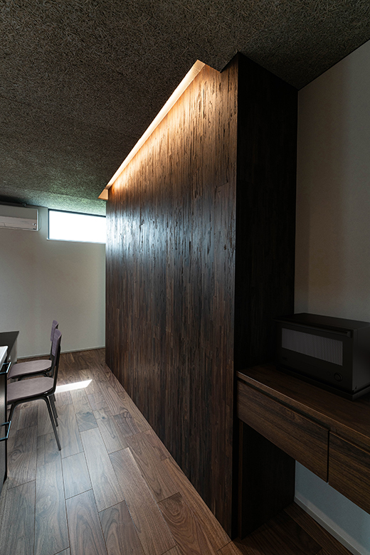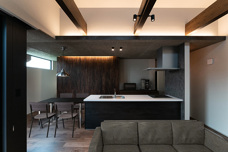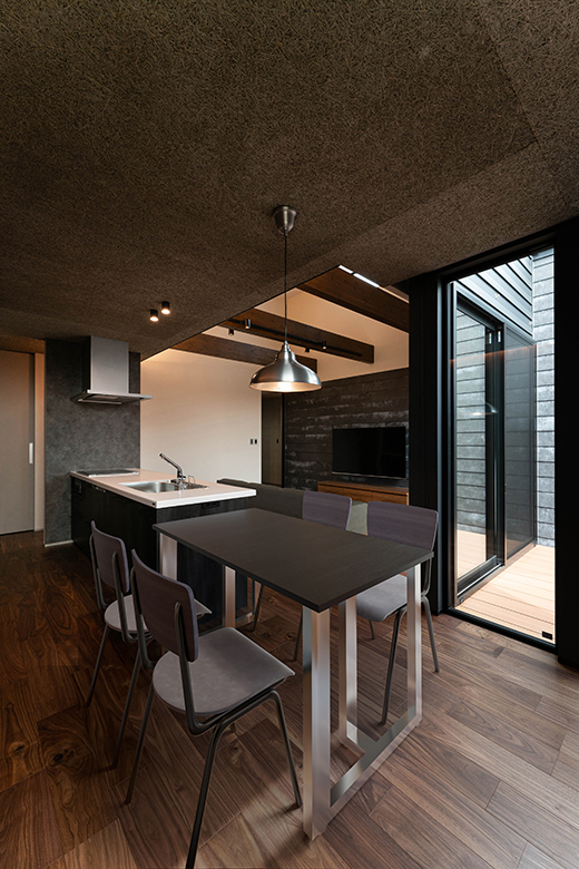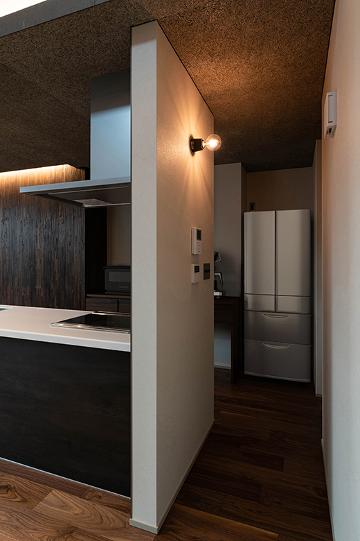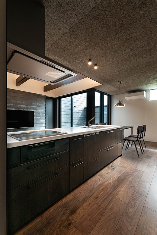 キッチンの天井には木毛セメント板をあしらい、素材の表情が生むリズムと勾配天井のラインが重なり合うことで、視線の広がりと空間の奥行きを演出。