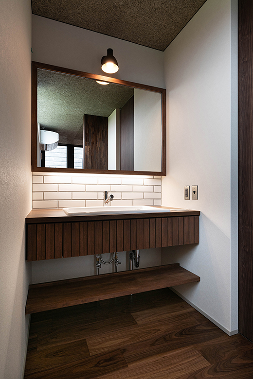 造作洗面台には、どこか懐かしさを感じさせるレトロなデザインを取り入れ、機能性とデザイン性を両立。