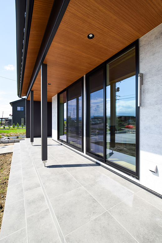 広々とした庭とつながる軒下空間では、椅子を置いてくつろいだり、家族みんなで食事を楽しんだりと、家の中と外がひと続きになる心地よい広がりを実現。