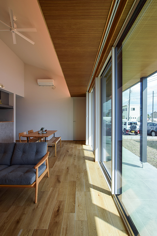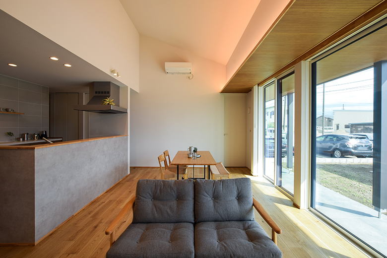 開放感あふれる高い勾配天井と大開口のあるリビングダイニングが魅力。
