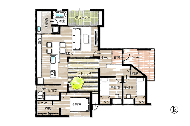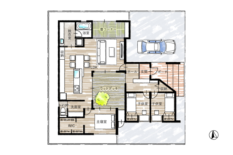 中庭は4.5坪(9帖)の広々としたウッドデッキ を採用し、キッチン・リビング・玄関・寝室から見えるように家の中心に設計しました。