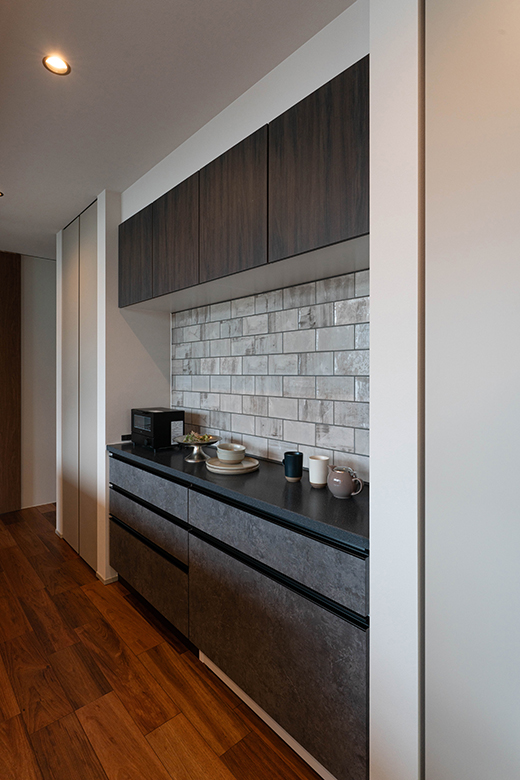 タイルやエコカラットをアクセントとして取り入れ、落ち着いた雰囲気に仕上げています。