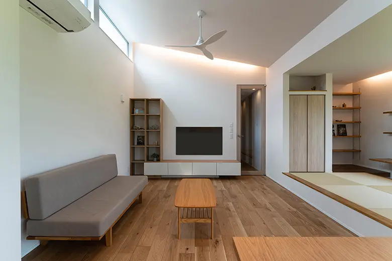平屋生活では、常時ご案内可能な、勾配天井を設けた開放感あふれるモデルハウスがございますので、ご来場お待ちしております。